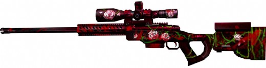 採用紅底白玫瑰製作而成的超完美狙擊槍「嗜血玫瑰K14」,使用暗色系的紅底色,更是襯托出槍上纏繞的白玫瑰與荊棘,直現讓人無法抵擋的神秘魅力,讓神出鬼沒的狙擊手在暗處更不容易被發現,強大的攻擊力更是不在話下,居高臨下突擊更是勢如破竹沒有誰能夠抵擋得住!