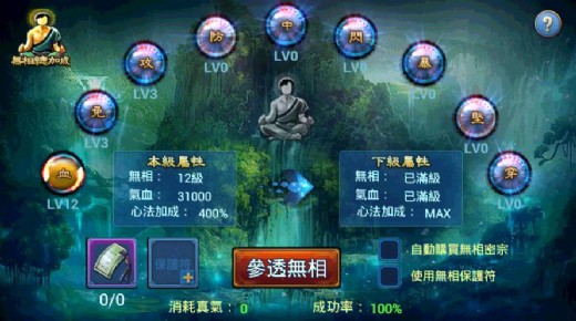 當玩家人物等級達到69級,且心法九個屬性均修滿42級時,將可直接對這九個屬性進行無相參透。每種屬性最高均可參透到12級,當玩家針該對心法進行參透時,將可獲得心法對應屬性的百分比加成,當人物的心法屬性等級愈高,參透後所獲得的加成也就愈多。除外,當人物屬性全參透到滿擊,還可額外獲得大量的屬性加成喔!