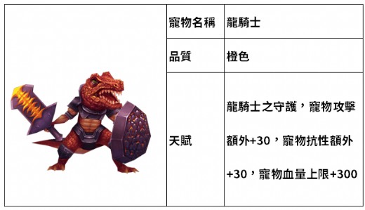 擁有龍頭人身的外觀,如同龍與人類的變種後代,加上手握重兵武器,可想而知該寵物本身的攻擊強度。當龍騎士升級後,本身將會額外提升攻擊力 30、抗性 30與血量上限 300,想要一位攻守兼具的寵物,龍騎士大哥想必是你的最佳選擇!