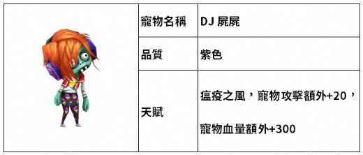 屍屍有兩種,一種是活屍,一種是死屍,而在《獵魔戰記》中新增的將是另類的DJ屍屍。帶著耳機呆頭呆腦的樣子,看似沒什麼戰力,不過由於本身頭好壯壯百毒不侵,因此DJ屍屍便把畢生的重心全放在攻擊方面,想要高傷害的寵物可以考慮這隻。當DJ屍屍升級後,本身將會額外提升攻擊力 20 與血量上限 300,屬於血量攻擊強的好寵。