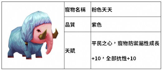 擁有類似長毛象外觀的粉色天天,可別以為牠看觀看起來呆呆的就小看這隻可愛的寵物,以防禦見長的寵物粉色天天,如同長毛象一樣擁有厚重的外表,為遊戲中防禦最高的紫寵。除此之外,當粉色天天升級時,防禦以及全部屬生的抗性均會同時成長10,為《獵魔戰記》中最佳的防禦寵物。