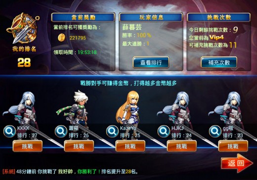 想要向其他玩家證實自己的實力,只要擁有一身高傲的戰鬥技巧,於競技場橫掃群雄,那麼玩家的威名可就享遍全伺服器嘍!於競技場部分共分為排名戰與1V1決鬥,初期玩家可透過排名賽與其他玩家進行一對一的決鬥,只要能擊倒該對手,那麼玩家的排名便能向上竄升,除外,還可從競技場上獲得高額金幣喔!