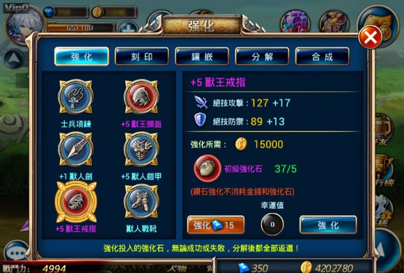 不論是角色培養,還是透過金幣刷劍魂,這些投資下去後便會一路成長,相信許多玩家們不至於擔心太多,但裝備畢竟是過渡時期的商品,當後期遇到較高階的裝備時,只要一更換,那初期辛苦打造的神裝不就白費?其實玩家們不用太擔心,在裝備強化的部分,該系統內還附加「拆解」的功能,玩家們可以把用不到、已換下的裝備在這進行拆解,拆解後的裝備,除了可獲得相對應等級的強化石外,先前投入的強化石也可一併取回喔!