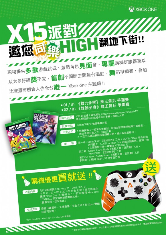 人氣女神NONO邀玩家決戰舞王舞后挑戰賽,優勝享XBOX ONE遊戲主題客房住宿X15派對同時舉辦Just Dance2015《舞力全開 2015》及Dance Central Spotlight《舞動全身》舞王舞后挑戰賽。人氣女神NONO辜莞允將親臨派對現場,親自示範最新舞步及最獨家的體感健身法。兩項賽事脫穎而出的優勝者,將獲得全台獨家的HOTEL COZZI和逸台南西門館之「COZZI vs. XBOXONE遊戲主題客房」住宿一晚(價值NT$9,680)。