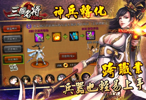 自今日起,《三國名將Online》全面開放神兵轉化系統!玩家可以自由變化名將神兵等級,就算是不同職業的兵器互相轉化也沒問題!另外,此次改版中,神兵系統還添加了貼心提醒功能:玩家以後不用再怕會浪費每天的將魂提煉!