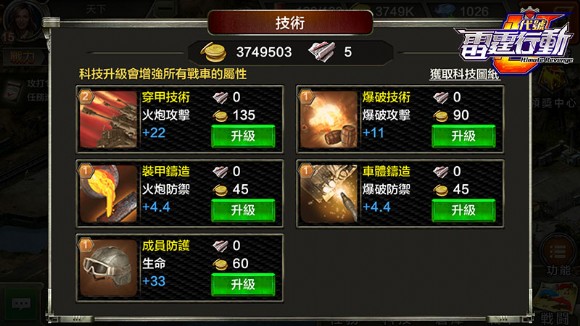 一個國家能研發出坦克,想必有一定的軍事科技能力,但想要讓軍事設備更強,那麼科技系統勢必一定要繼續提升。《代號:雷霆行動》當前共設有5項科技系統,分別為穿甲技術、爆破技術、裝甲鍛造、車體鍛造與乘員防護。每一項科技等級的提升,玩家的所有部隊都能獲得相對應的屬性能力,想要快速提升自己軍隊的實力,那麼可要特別重視軍事科技的能力。