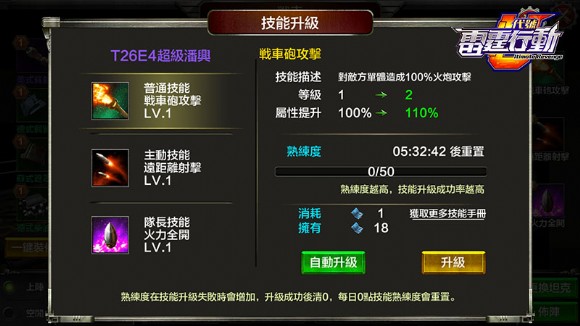 遊戲中每輛坦克都有三種技能,分別為普通技能、主動技能與隊長技能,普通技能為該坦克的基礎能力;主動技能屬於該坦克的進階能力,並於戰鬥中隨機觸發,而隊長能力需玩家將該坦克設置為隊長時才會觸發,若該坦克只為玩家陣中的一員,可暫時捨棄該技能。每種技能的提升均會消耗一定數量的道具,且均有一定的失敗率,玩家們想要培訓一輛屬於自己的坦克,可要多花點心思了。