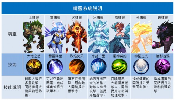 《復仇者之劍》內目前共有土、雷、火、冰、風、光、暗這七種精靈,剛開始進入「精靈系統」時,每位玩家都可獲得土精靈。