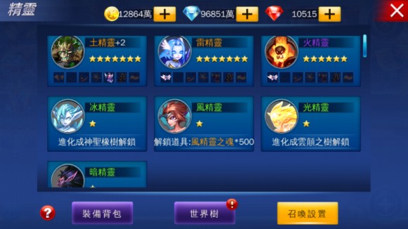 若是想要獲得其他的精靈,需進入世界樹,並使用聲量和金幣聚靈。當世界樹提升至戰爭古樹即可獲得雷精靈、進化至科技古樹即可解鎖火精靈,以此類推即可獲得更多精靈。