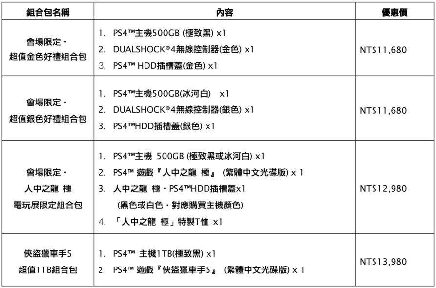 【2016台北國際電玩展 PlayStation會場限量販售PS4 組合包 內容】