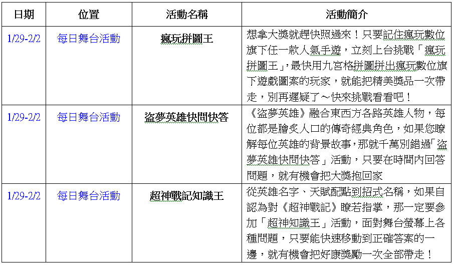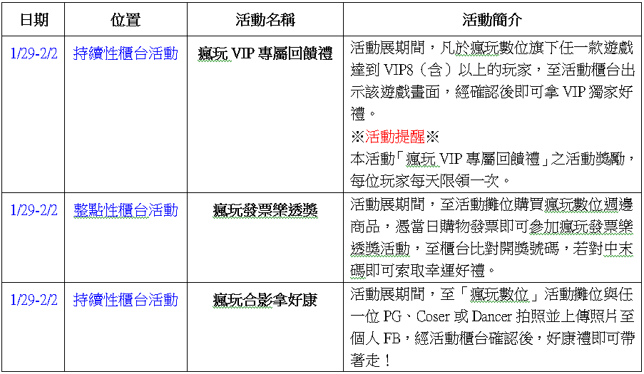 官方表示,電玩展期間將舉辦各式各樣的舞台活動及販售活動,同時推出各種周邊產品來販售,更多詳細的重點活動,玩家可以參考下列表格: