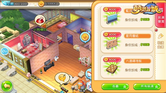 在《夢想星城》中,每一位星城的新移民,一進入遊戲就會擁有自己的小房子,並且配給基本的傢俱,還有一片小陽台。在每日繁忙的工作後,進入完全屬於自己的空間,實在令人心靈倍感舒暢阿! 隨著遊戲的進行,玩家可以逐漸的購入各式各樣設計新穎且具有各種不同特色的傢俱,還可依個人喜好擺設在房間的任何位置。遊戲中的傢俱設計,不僅類型豐富,許多細緻的小物品也都包含其中,玩家可以隨心所欲打造屬於自己的房屋裝潢喔!而越精心的佈置,也有助於提高玩家在遊戲中的「身價」,這在遊戲中是很重要數值喔!打造屬於自己的夢想房屋,還可增加自己在星城中的身份地位,實在是太划算了啊!