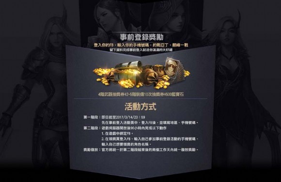 為了召集勇者們對抗闇黑魔神「奈帕拉坤」,愛麗莎特別準備了軍備物資要給事前預約登錄的勇者們。玩家們只要到事前預約登錄的活動頁上填寫相關資料,且於伺服器開放之後的報到期限內,到報到頁面填寫遊戲中的角色名稱,並完成身分認證,即可領取限時虛寶好禮!