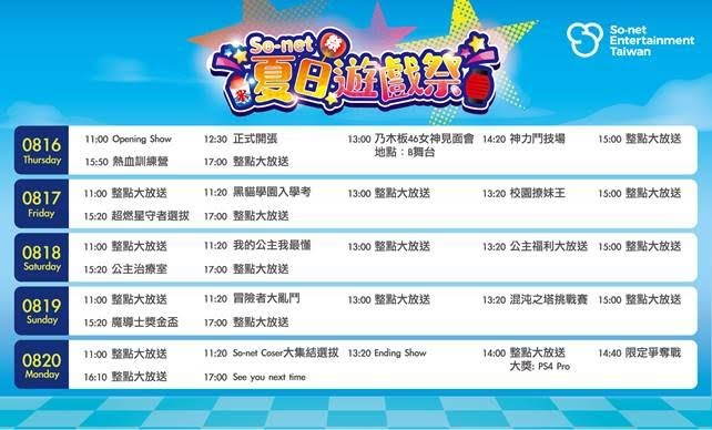 由8月16日開展日起,將由乃木?46擔任So-net特別來賓,與玩家們一同為So-net 夏日遊戲祭揭開序幕,再由旗下代理的《超異域公主連結☆Re:Dive》、《神式一閃 頂上決戰》、《戰鬥女子學園》、《問答RPG 魔法使與黑貓維茲》、《白貓Project》、《轉吧!小海女! ~在天空與海洋之間~》6款遊戲各自推出不同的玩家活動,挑戰者將依晉級程度獲得不同獎勵,冠軍玩家將會挑戰營運團隊精心設下的難關,為全服爭奪限定獎勵!展期最後也將公開神秘驚喜與抽出最大獎PS4 Pro,並同步祭出感謝大放送。相關活動資訊與事前報名已在各遊戲粉絲專頁公布,歡迎有興趣的玩家前往了解!