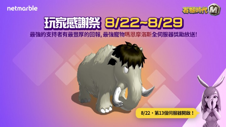 歡慶上市滿月,《石器時代M》宣布將於22日舉辦盛大的慶祝活動。活動將於22日11:00起舉辦至29日23:59止,官方將免費贈送全服玩家和於活動期間內創建角色的玩家豐厚的獎勵,如3★紫色寵物「瑪恩摩洛斯」、長毛象的皮甲套裝3天以及大的肉x30等。