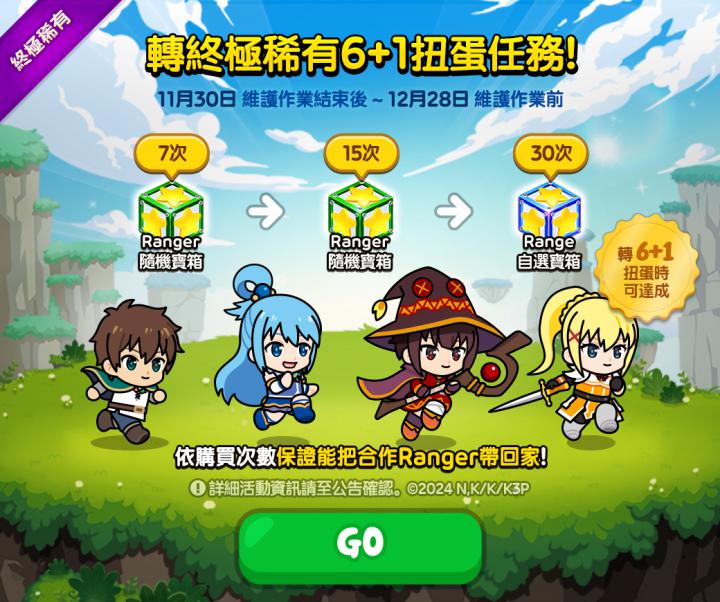 於指定活動期間前往LINE GAME Taiwan Facebook完成指定任務,就有機會獲得限定合作Ranger「阿克婭」和「惠惠」等豪華獎品。邀請各位玩家一起踴躍參加!