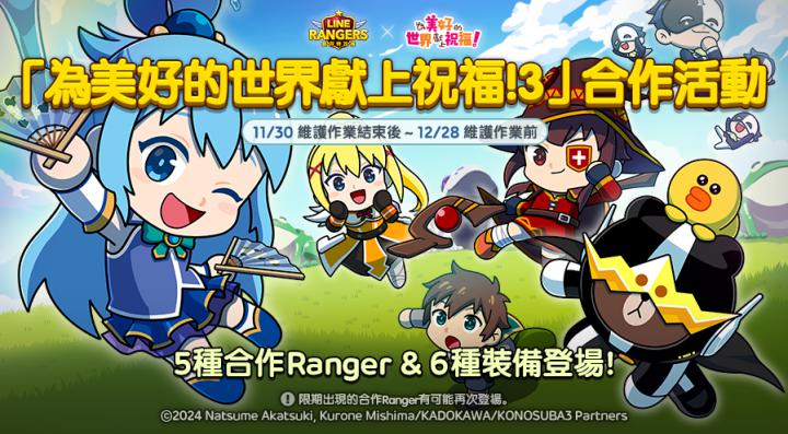 LINE旗下遊戲服務「LINE GAME」所推出的塔防遊戲《LINE Rangers》今(30)日將與動畫《為美好的世界獻上祝福!3》展開合作活動。