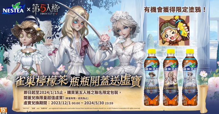 雀巢檸檬茶x《第五人格》「瓶瓶開蓋送虛寶」,即日起至2024年1月15日 23:59止,於台灣四大便利商店購買《第五人格》活動限定包裝瓶,開蓋即可獲得一組遊戲虛寶序號,可憑瓶蓋序號兌換遊戲虛寶,有機會獲得稀世時裝還有活動限定的專屬塗鴉等多項豪華虛寶,詳細獎勵如下: