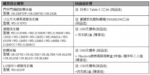 凡於活動期間4月1日至5月31日,購買LG對開冰箱、滾筒洗衣機指定型號,回函即可獲得白色LG G Tablet 8.3、LG抗敏除螨機、禮券等多項指定好禮。