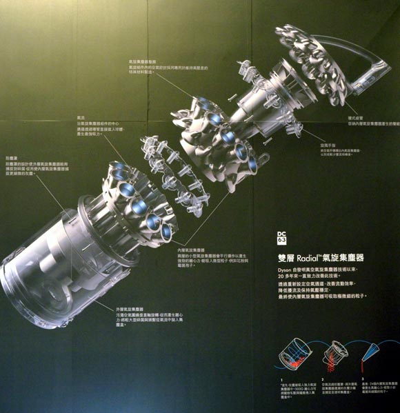 - 雙層圓錐氣旋科技( 2 Tier Radial cyclones):戴森工程師團隊打造了200款原型機器以改良氣旋科技,高速離心力甩出小至0.5微米的微塵,直徑比人類頭髮的直徑還要小200倍。