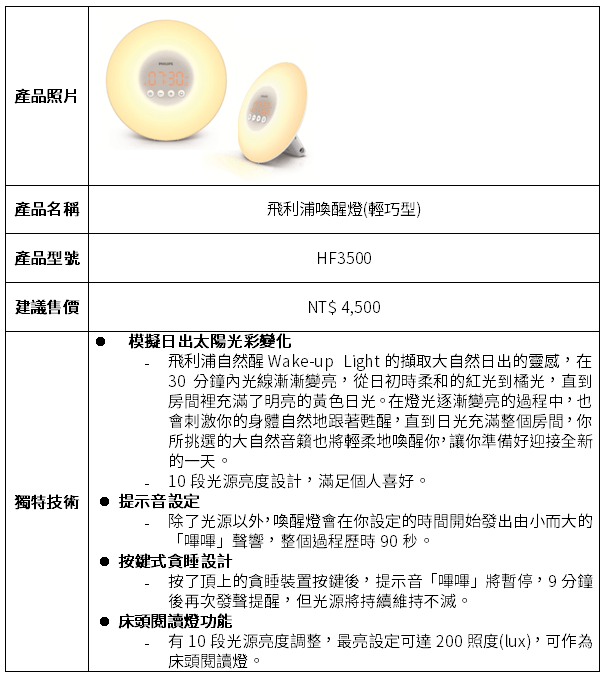 飛利浦為解決現代人起床問題,推出「飛利浦喚醒燈」,透過模擬自然日出光感,於起床前20~40分鐘,從微光逐漸轉變成明亮黃色日光,遵循人體生理時鐘自然喚醒,讓消費者每天自然甦醒。
