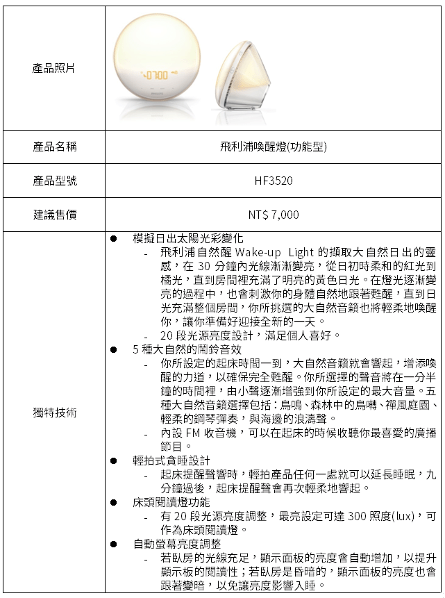 HF3520內建20段光源亮度控制,消費者可依照自己的喜好進行設定,搭配5款大自然音效:鳥鳴、森林中的鳥囀、禪風庭園、輕柔鋼琴彈奏、大海浪濤聲,於90秒內由小聲逐漸增強輕柔喚醒。另有FM收音機功能,以及最高亮度可達300照明度(lux),兼具床頭燈及FM收音機功能。建議售價NT$7,000。
