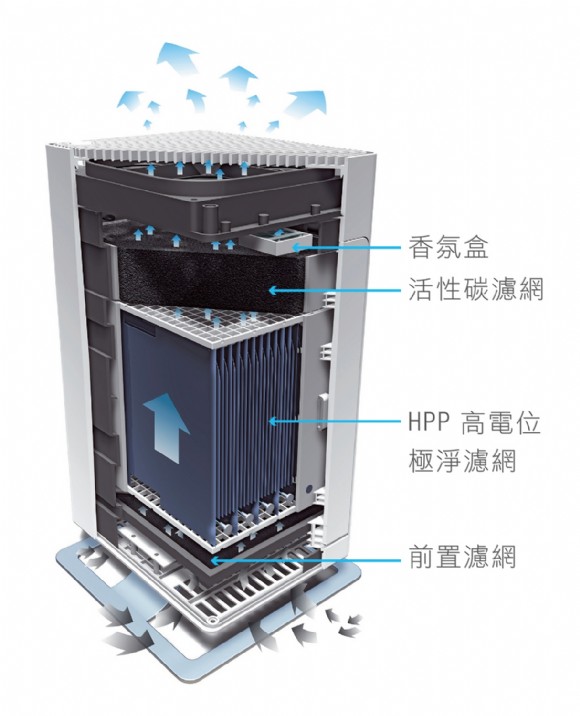 - 第二層 - HPP 高電位極淨濾網:窄化的極位導板設計,能將更微細的污粒分子極化帶電並產生強大磁吸效應,捕捉超細微的花粉、黑灰微粒、煙塵、病毒、細菌等。