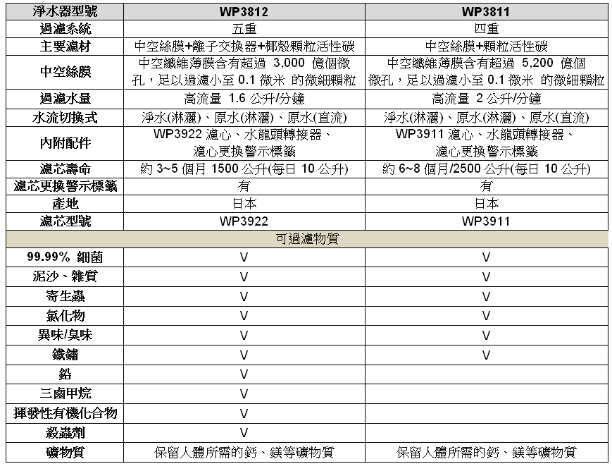 「飛利浦超濾龍頭式淨水器系列」,擁有獨特的超濾微米淨水科技,採用多重過濾系統,其中,超長效機款WP3811濾芯壽命達2500公升或6~8個月(濾芯壽命依照當地水質與水壓不同而有所增減期限),是目前同級中最長效機款,它擁有主要過濾層會先過濾較大的雜質如鐵鏽、沉澱物,再經過顆粒活性碳先微濾水質,將難聞的氯氣與異味濾除,接著進入輔助過濾層可擋住泥沙、微粒,進入中空絲膜後,藉由超過5200億個微孔,可有效過濾99.99%的細菌與鐵,足以過濾小至0.1微米的微細顆粒,藉由層層過濾,隔絕有害污染物,最後保留水中礦物質如鎂與鈣 。另一款高階機種WP3812則可過濾可溶解鉛。全系列技術規格符合日本工業標準(JIS),技術效能依據JFRL檢測分析報告。