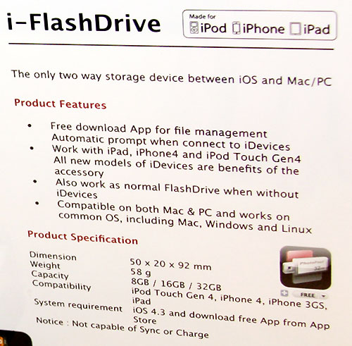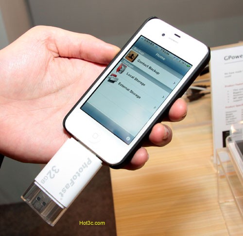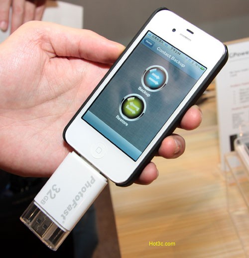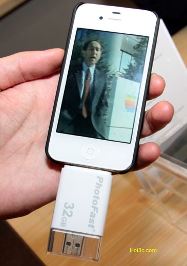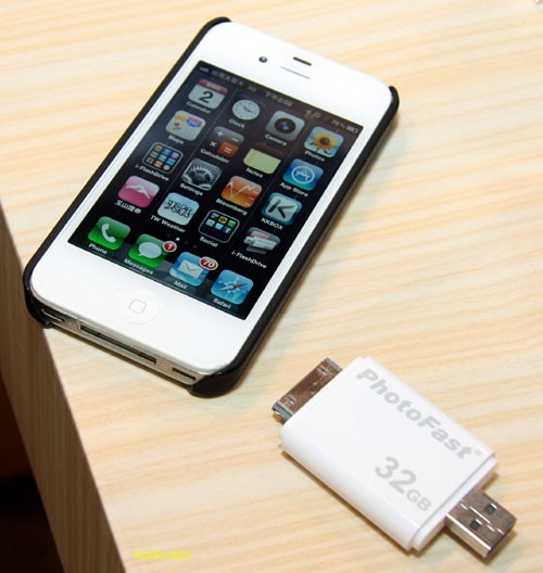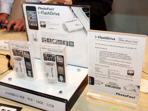 PhotoFast 在 Computex 2011 發表了可以直接讓 iOS 裝置存取的隨身碟 i-flashDrive,容量最大達 32GB。這款裝置可以說延伸了 iPhone/iPad 的外接儲存能力,用戶只需安裝所提供的 App 便可輕鬆讓您的愛機擴充儲存媒體,但只支援 iOS 4.0 以上系統: