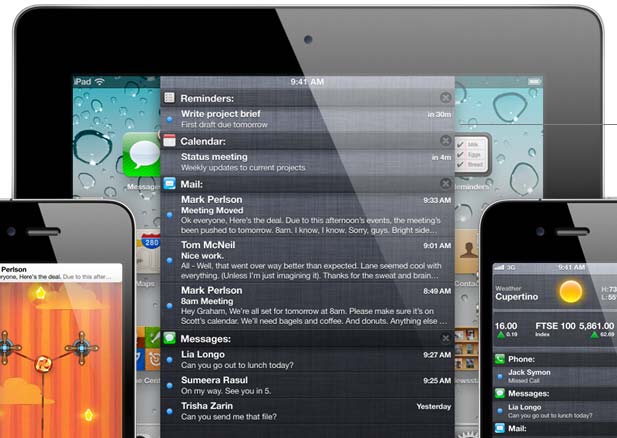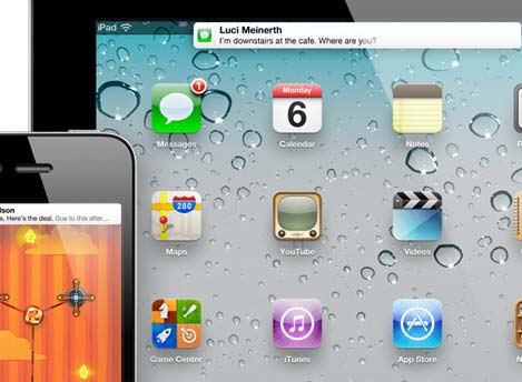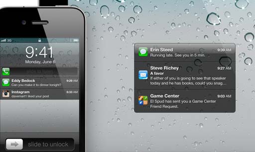 iOS 5 引進了與 Android 類似的訊息中心(Notification Center),只要由螢幕頂端往下拉,就可以立即顯示所有通知訊息,像是簡訊、未接來電、行事曆提醒、App 提醒等等。甚至在螢幕保護狀態下,只要輕輕滑開螢幕就會立即導向有通知的 App 。