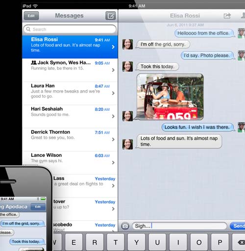 iMessage 將 iPhone 的簡訊功能擴展到所有 iOS 裝置,包括 iPhone, iPad, iPod touch 等等,可透過 Wi-Fi 或 3G 向其他的 iOS 5 裝置(個人或群組)發送文字簡訊、相片、影片、聯絡人資訊等等。iMessage 也提供了傳送/閱讀收據的功能、打字指引以及加密能力。
