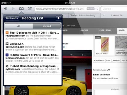 iOS 5 也為 Safari 加入許多新特色,包括了可以設定字體大小的 Safari Reader (單欄閱讀模式),可輕鬆的捲動或閱讀文章。也提供了 Reading List 功能,可以將文章儲存起來稍後再閱讀,也能自動顯示在其他所有 iOS 裝置上。另外終於加入了分頁標籤 (Tabbed Browsing),讓 iPad 上切換不同網頁更加便利。