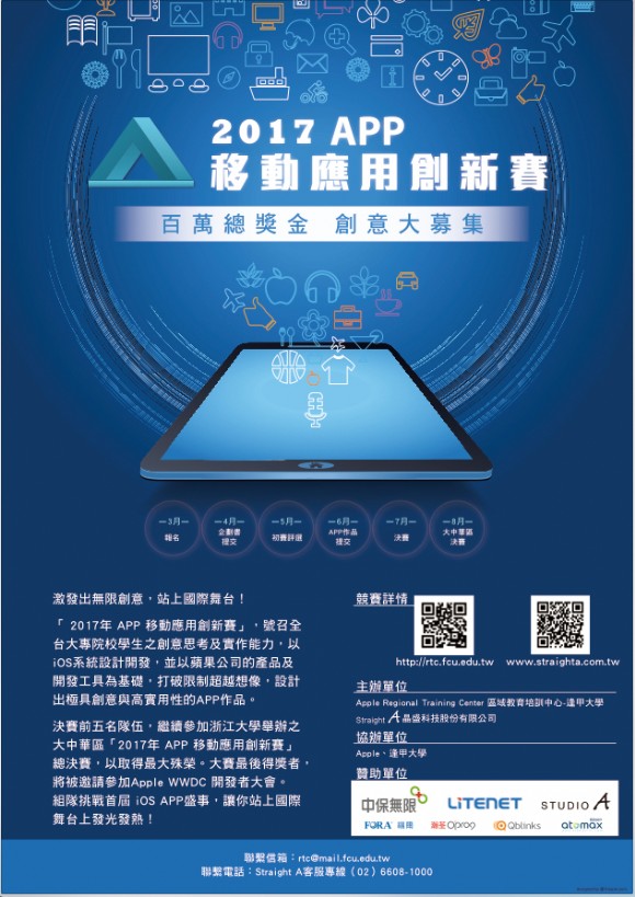 全球軟體業蓬勃發展,程式人才需求若渴,全台唯一 Apple區域教育培訓中心(Regional Training Center,簡稱RTC) 與 STUDIO A校園店 Straight A合作,首度在台舉辦2017「APP移動應用創新賽」,即日起開放大專院校學生自組團隊報名,並將選出前五名台灣優秀團隊參加大中華區總決賽,冠軍還將受邀赴美參加 Apple年度盛會—WWDC(Apple Worldwide Developers Conference,蘋果年度開發者大會)。