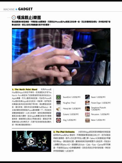 iPad除了當電腦還可化身各種樂器,透過本期GQ iPad版能欣賞到最新最炫的樂團表演,用iPad當樂器輕鬆奏一曲,聲光音響媲美演唱會現場!