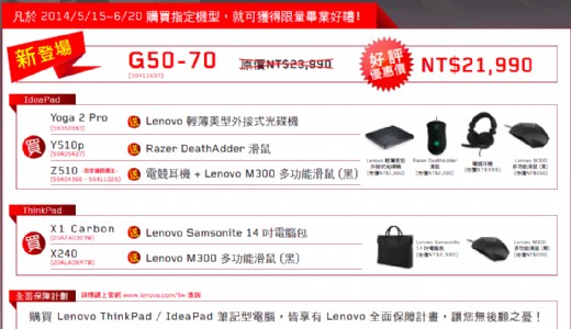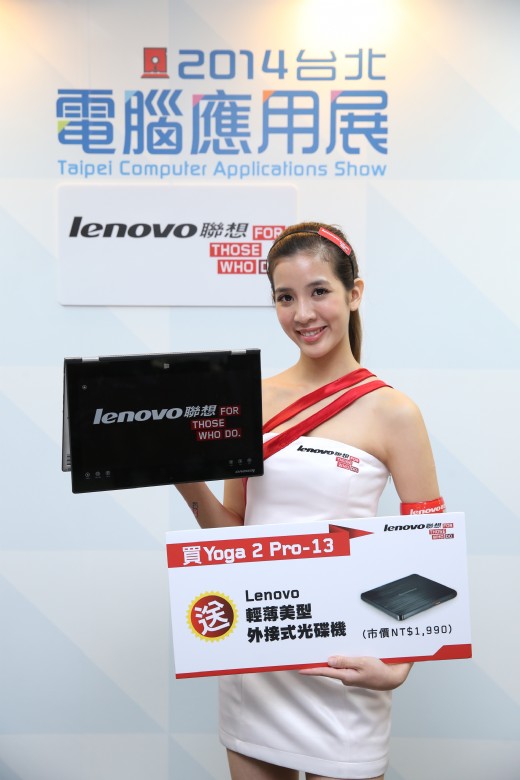 Lenovo聯想連續六季蟬連全球第一大個人電腦品牌,為了回饋長期支持的消費者,特別於2014電腦應用展推出全新Yoga Tablet 10 HD+,延續Yoga系列的多模式特點,採用最新 Qualcomm 處理器,並搭載Full HD超高解析度螢幕,高畫質影像讓平板變成個人的隨身電影院;超長效18小時電池續航力,讓喜愛追劇的粉絲不再掃興,熬夜看整晚都沒問題!此外還有自上市以來持續好評不斷的話題新機Yoga 2 Pro,具備360度翻轉功能,提供四種使用模式讓你一秒變身十項全能鋼鐵人,隨時隨地保持最佳工作狀態!應用展期間更推出獨家好康,現場購買Yoga 2 Pro還能將Lenovo輕薄美型外接式光碟(市值NT 1,990)帶回家!而讓電玩玩家們愛不釋手的IdeaPad Y50-70及Lenovo聯想經典款商務機ThinkPad X240s也同步推出精美贈禮,分別贈送專業玩家級Razer DeathAadder極酷滑鼠(市值NT 2,290)及OL最愛甜美粉心無線滑鼠(市值NT 699),有買有拿讓民眾荷包賺飽飽,預計又將掀起搶購熱潮!