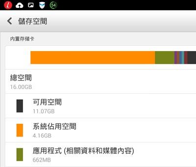 Yoga Tablet 內建 16GB記憶體,第一次開機後可用空間約 11GB:
