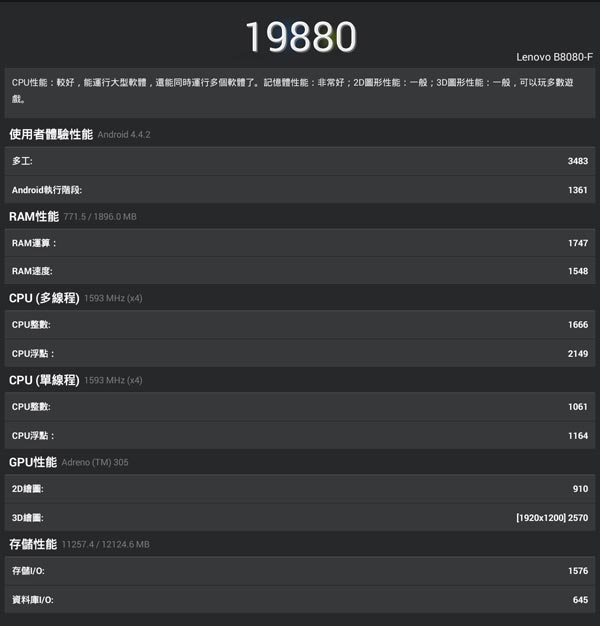 使用安兔兔實測,分數為 19880 並不算高: