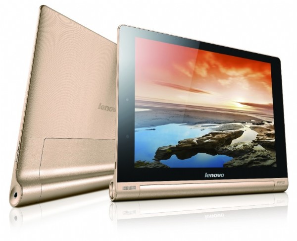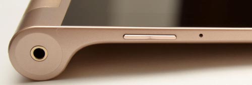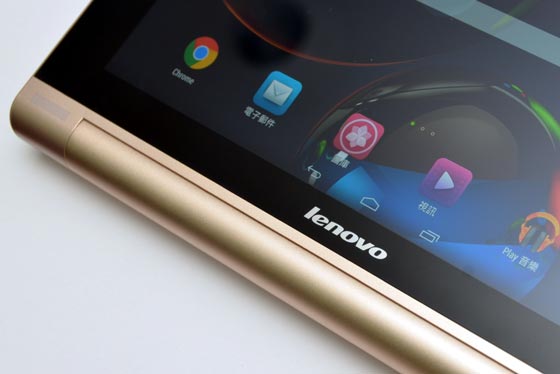 我們借測的是香檳金色款式相當華麗。搭載 10.1吋 IPS 面板的 Yoga Tablet 10 HD+ ,螢幕畫素達 1920x1200(請注意不是 1920x1080),使用起來相當清晰。杜比音效前置雙喇叭就在圓軸兩側::