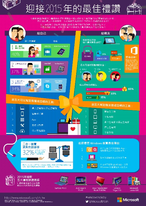 隨著聖誕佳節與2015新年將近,台灣微軟特別進行2015新希望和禮物大調查,根據統計調查結果,受訪者表示能夠幫助自己達成目標的工具,第一名為「桌上型電腦或筆記型電腦」,第二名為「智慧型手機」,第三名是則是「App」,提供使用者隨時隨地都能提升生產力,完成更多;台灣微軟貼心準備5大禮物清單,首選推薦 Surface Pro 3,集結平板與筆電的優勢,結合手寫筆的應用,成為消費者選購二合一裝置或變形筆電的最佳選擇!