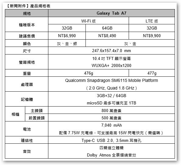台灣三星電子宣布正式在台推出Galaxy Tab A7,以絕佳設計、娛樂高效能、無縫行動裝置生態圈,讓消費者隨時隨地一手掌握學習與娛樂。Galaxy Tab A7將推出WiFi及LTE兩種版本,依型號共有灰、金、銀三色可供選擇。WiFi版32GB建議售價NT$6,990、64GB建議售價NT$8,490;LTE版32GB建議售價NT$9,900,上述三款型號將自10月1日起陸續於全台通路上市(註一)。