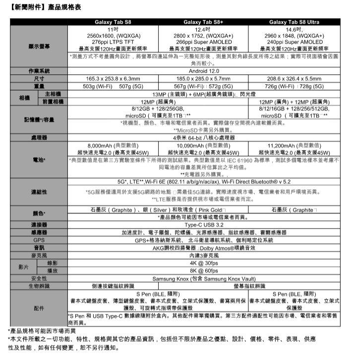 三星電子總裁暨行動通訊事業部負責人TM Roh表示:「人們愈來愈倚重以影音的方式娛樂並維持人際關係,三星亦了解平板最吸引人之處即為大螢幕和便攜性。三星以多年的行動創新體驗為基礎,實現Galaxy Tab S8旗艦系列的精湛蛻變,更以Galaxy Tab S8 Ultra突破平板的規格極限。」