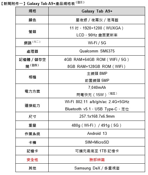 繼發表Galaxy Tab S9系列旗艦平板,乘勝追擊再推全新Galaxy Tab A9+,讓消費者以親民價格,輕鬆擁有沉浸大螢幕、影廳級環繞四喇叭、強大處理器夢幻新機。Galaxy Tab A9+共推出Wi-Fi及5G兩種版本,及星夜銀、夜幕灰、湛海藍三色選擇。Wi-Fi版4+64GB及8+128GB版本建議售價分別為NT$6,990、NT$8,490;5G版4+64GB建議售價NT$9,490。上述機型預計10月下旬起於全台三星智慧館、三星商城及各大經銷通路上市。此外,自上市日起至11月30日,凡於三星智慧館、三星商城購買Tab A9+ 8+128GB版本,隨貨送書本式保護殼,數量有限送完為止(註一)。