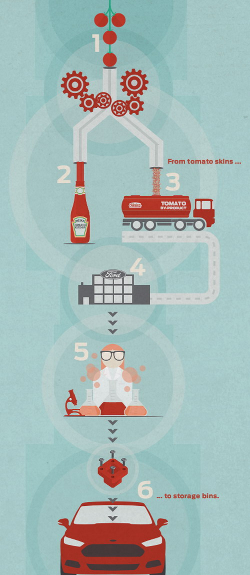 Ford 汽車於兩年前正式開始與Heinz、Coca Cola、Nike與P and G等國際知名品牌合作開發百分百植物性塑膠,從布料到包裝,希望能降低石化塑膠的使用比例,以達到對保護環境的承諾。Ford 塑化研究技術專家Ellen Lee表示: 「我們正在測試將食物轉化成車輛用品的可能性,並期望在保護地球的同時更能製造出更高強度且輕量化的生物材質。」而Heinz 身為全球番茄醬領導品牌,也致力於將製作番茄醬時剩下200萬公噸的番茄外皮、籽、莖回收再利用。對於這次的合作,兩家廠牌都抱以高度期待。Heinz 包裝研發部門副總監Vidhu Nagpal 表示:「雖然還在研發階段,但我們對和Ford合作製造100%植物性塑膠感到非常興奮。」