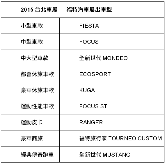 2015台北車展盛會在即,福特汽車搶先預告今年車展重頭戲─全新旗艦房車Ford Mondeo將於12月26日正式上市,嶄新外型設計在都會奢華感間流露時尚品味。本次全新Ford Mondeo將領軍福特九大車系的陣容,包括暢銷車型Focus和休旅家族Kuga、EcoSport等共十一輛車全員亮相;同時,全新世代經典跑車Ford Mustang,也將同場現身。