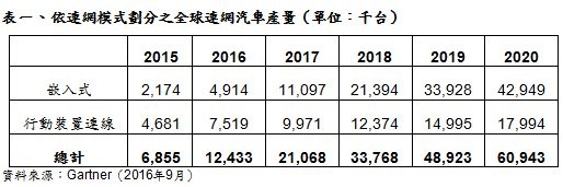 根據國際研究暨顧問機構Gartner最新預測,無論在成熟或新興汽車市場,連網汽車的產量都在迅速增長中。這類透過嵌入式通訊模組或行動裝置連線實現資料連接的新型汽車,2016年產量預計達1240萬輛,到2020年將增至6100萬輛(參見表一)。