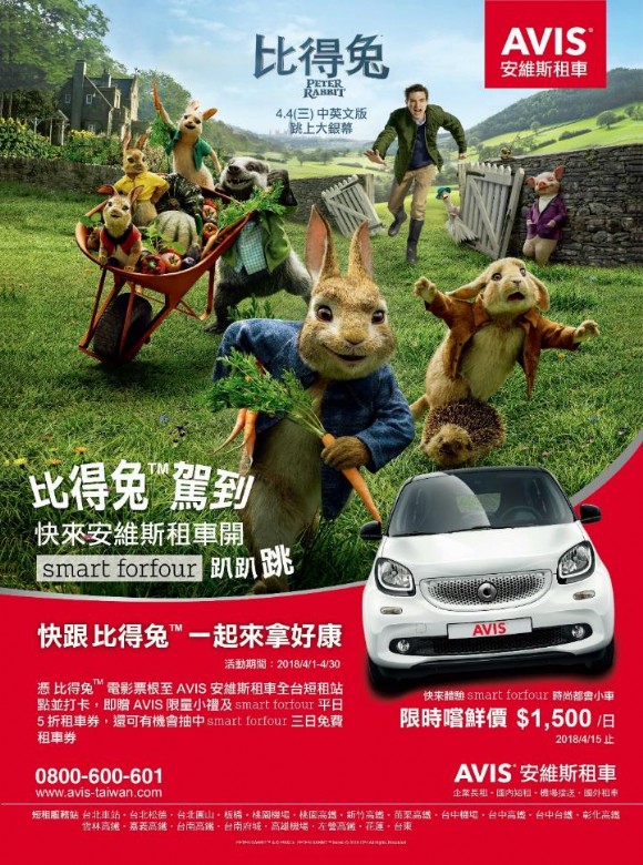 世界著名的童書故事《比得兔》於一年一度復活節之際躍上大銀幕,AVIS安維斯租車邀請熱愛比得兔的朋友們一起趴趴跳展開旅行,AVIS安維斯租車是台灣市場中唯一能提供跨國以及台海兩岸中、港、澳、台四地汽車租賃服務的國際租車品牌,目前在台灣有超過30個長租、短租服務據點,提供高品質的轎車、休旅車、豪華車款,滿足消費者對於旅遊的需求和車的期待。時尚都會小車smart forfour加入租車產品線,更豐富AVIS安維斯租車車款的多元性與選擇,嬌小靈活的smart forfour與超萌《比得兔》首波優惠活動,自即日起至3月31日展開,凡於AVIS安維斯租車消費滿NT$7,000,即可獲得2張《比得兔》電影票,以旅遊豐富生活的同時,回憶你我童年的繪本故事《比得兔》。此外,於4月1日至4月30日憑《比得兔》電影票根,至AVIS安維斯租車全省租車站點於臉書完成打卡,即可獲贈smart forfour平日五折租車券乙張與AVIS限量好禮,更可參加加碼抽獎活動,有機會抽中價值NT$8,400的smart forfour三日免費租車券,數量有限,送完為止。