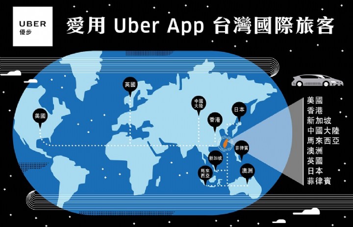 在台灣, Uber App 已成為國際旅客來台搭乘的最佳選項之一,根據內部資料統計,在台灣使用 Uber App 叫車的國際旅客來自79個國家,其中前十名的國際旅客主要來自美國、香港、新加坡、中國大陸、馬來西亞、澳洲、英國、日本與菲律賓等。