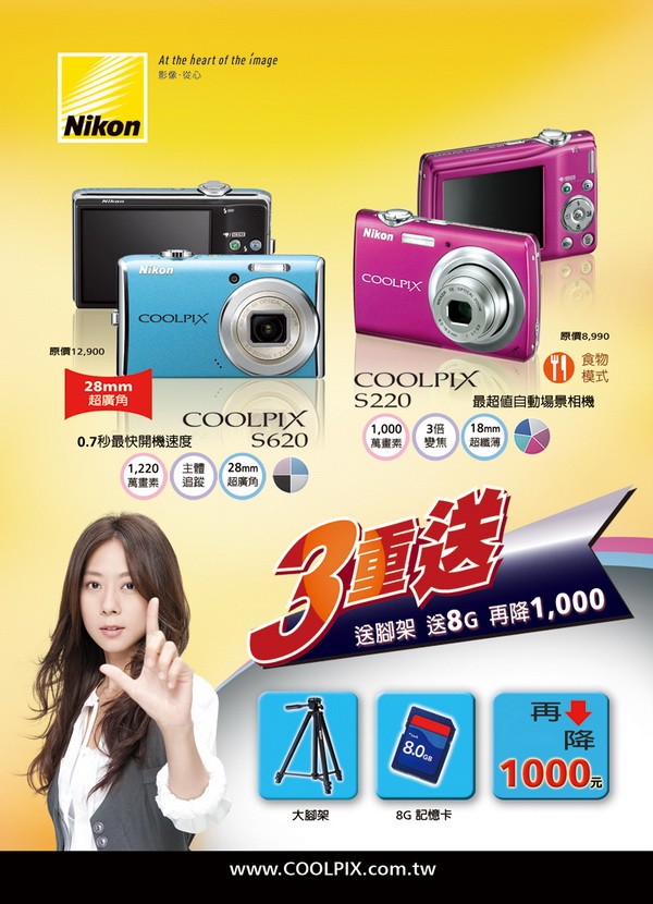 日系相機大廠Nikon由國祥貿易代理多年,始終是消費者的最愛品牌,今夏新推出的Coolpix系列消費機具有強大防手震、高感光特性等特性,即日起至八月底,推出『Nikon夏日好禮三重送』,不論是S620口袋型廣角機,還是S220輕薄形相機,買就送大腳架、8G記憶卡,再降一千,讓你買到賺到,全面讓你輕鬆品味Nikon Coolpix S曲線機的時尚魅力。