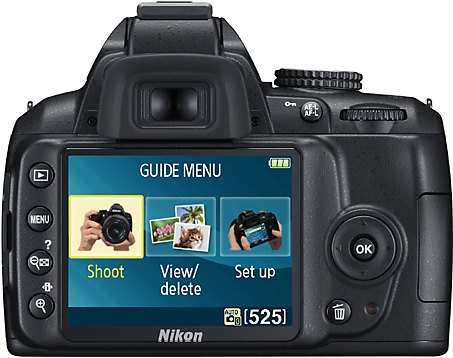 不過 D3000 加入了一個嶄新的拍攝模式: 指引拍攝(GUIDE)。這是更適合初學者的拍攝方式,除了可讓用戶根據特定拍攝需求選擇拍攝模式,也可讓用戶自行進一步調整相機的設定來達到最佳拍攝效果。