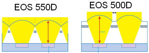 550D 採用了與 7D 同等級的 18MP CMOS 感光元件,這個 CMOS 元件加寬了每個畫素的受光面積,但同時也減少了厚度,讓光線更能無阻礙的抵達 CMOS金屬層。因此,雖然 18MP 的 550D 與 14MP 的 500D 感官元件總面積相同,但並未因此折損每個畫素的品質。甚至,550D 還有過之而無不及: